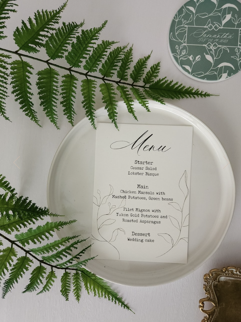 Embrace the winter theme with cool-toned palettes, snowflake motifs, or botanical illustrations like pine, juniper, or winter berries. Many of our designs at The Patterned Desk can be personalized with seasonal patterns to give your wedding its own winter signature!