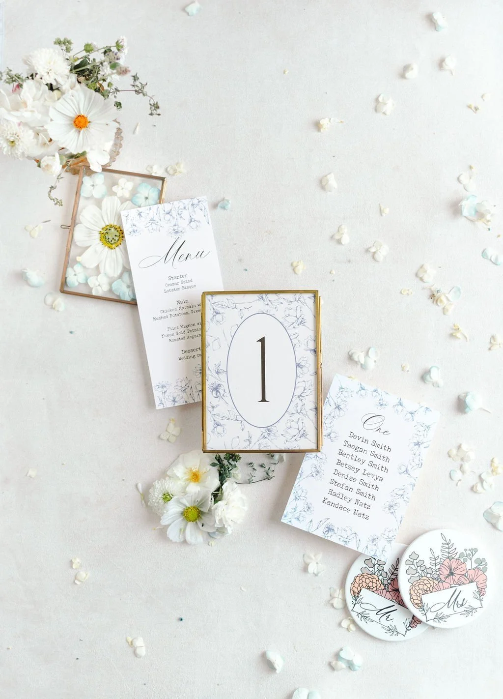 Crafted using high-quality materials and romantic details like calligraphy and florals, our designs add a cohesive, polished look to your day-of decor.