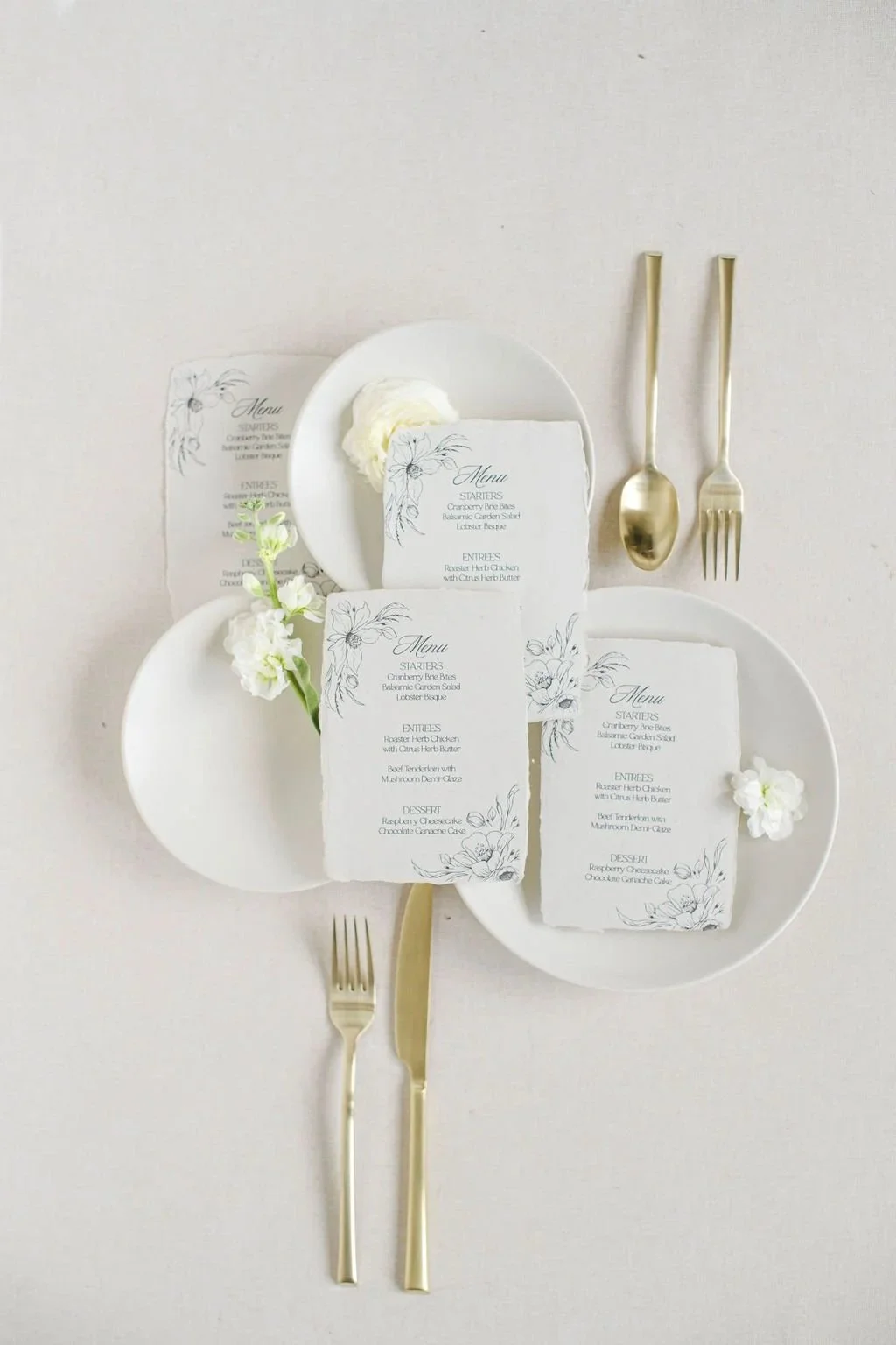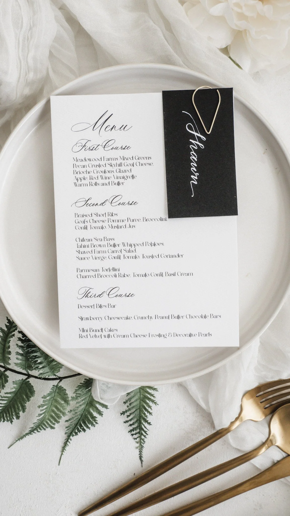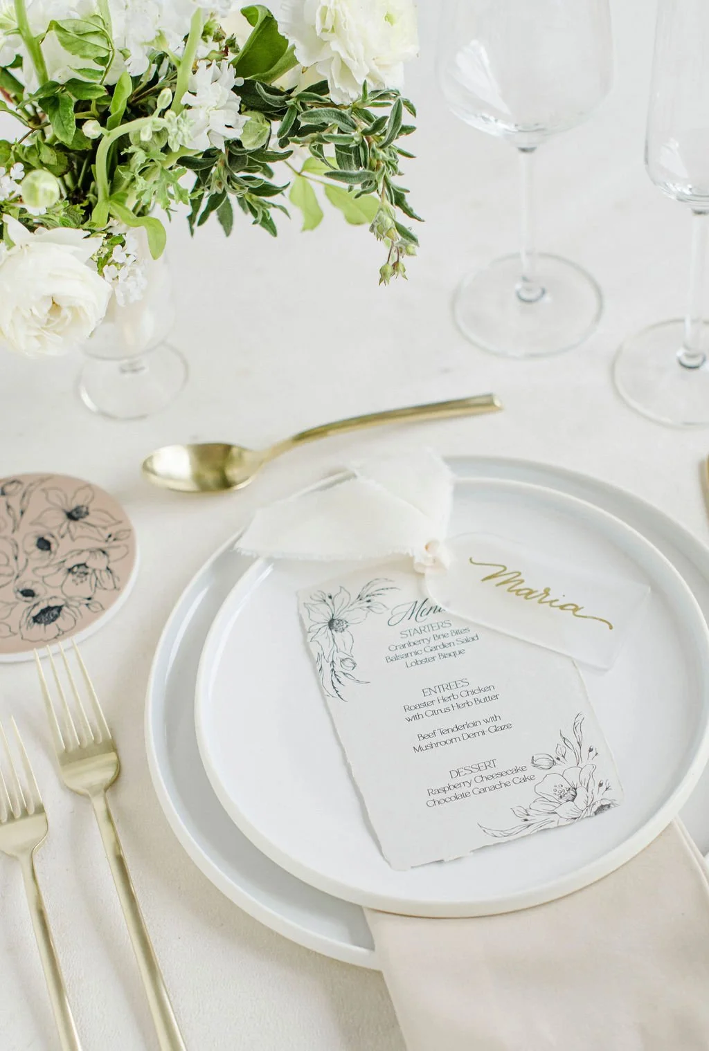 Enhance your reception with custom place cards, menus, seating charts, and table numbers—each piece designed to reflect your story with timeless sophistication.