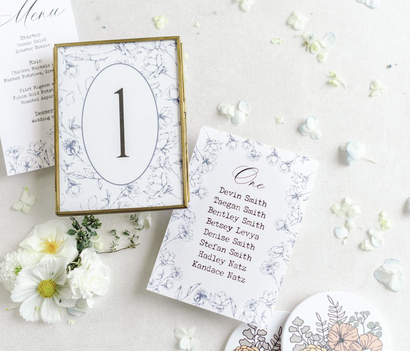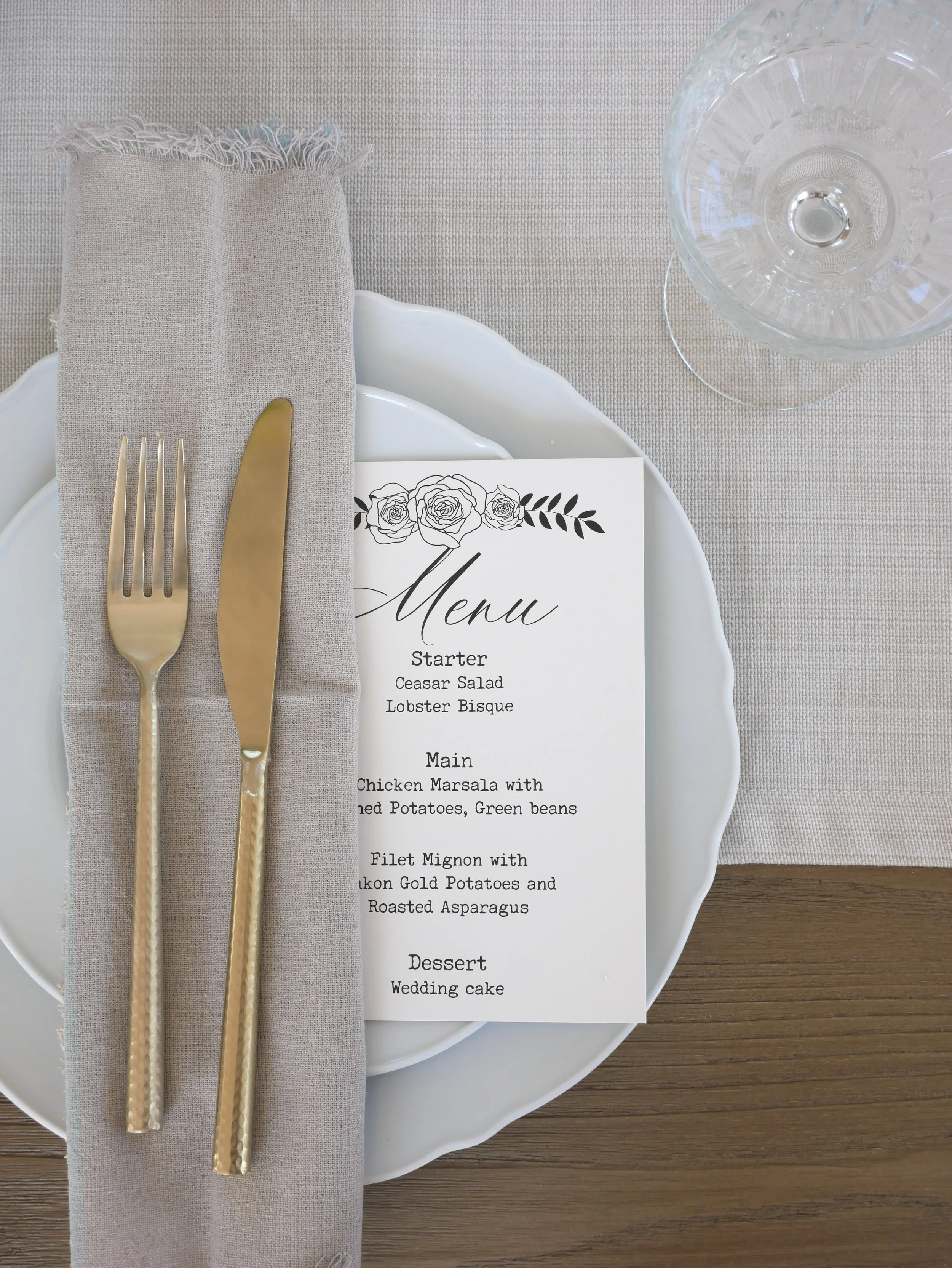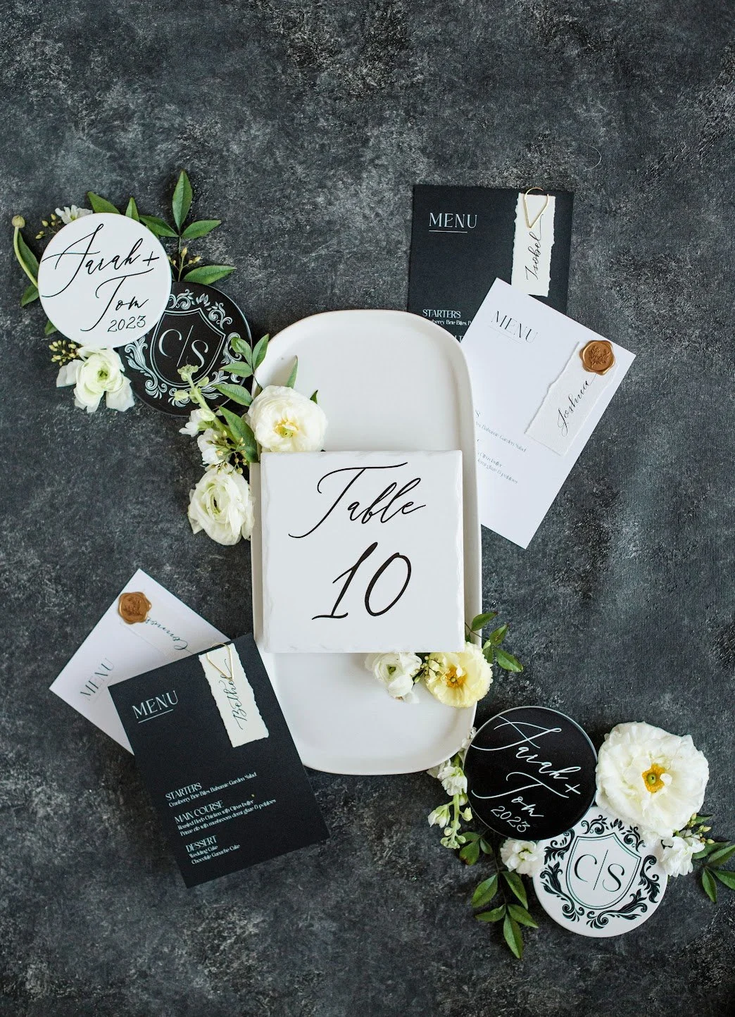 Enhance your reception with custom place cards, menus, seating charts, and table numbers—each piece designed to reflect your story with timeless sophistication.