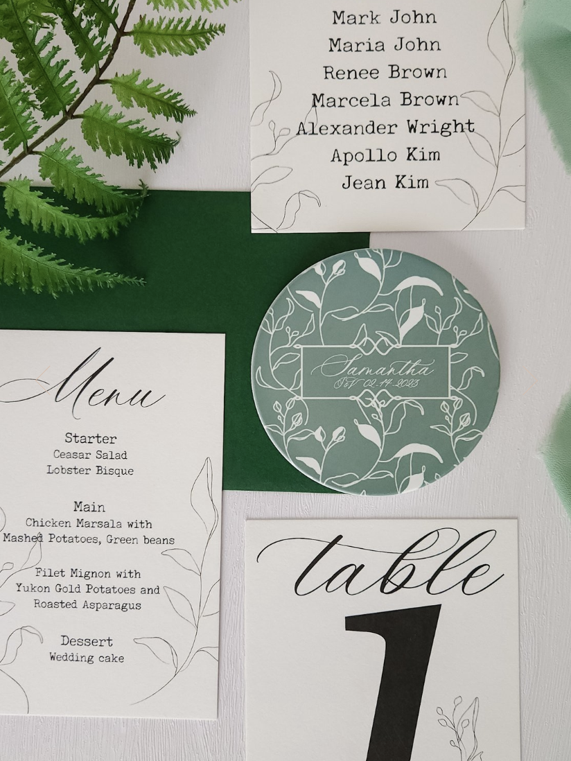 Our second package is made of the Coaster, Seating Card and Table Number. This also includes place cards on printed paper or handmade paper with calligraphy, ribbon or wax seal. As it’s name states, you will have everything you need to help your guests find their seat and bring home memories of your wedding day. You can chose a matching design or entirely different combination, whatever direction you take it will truly elevate your wedding decor.
