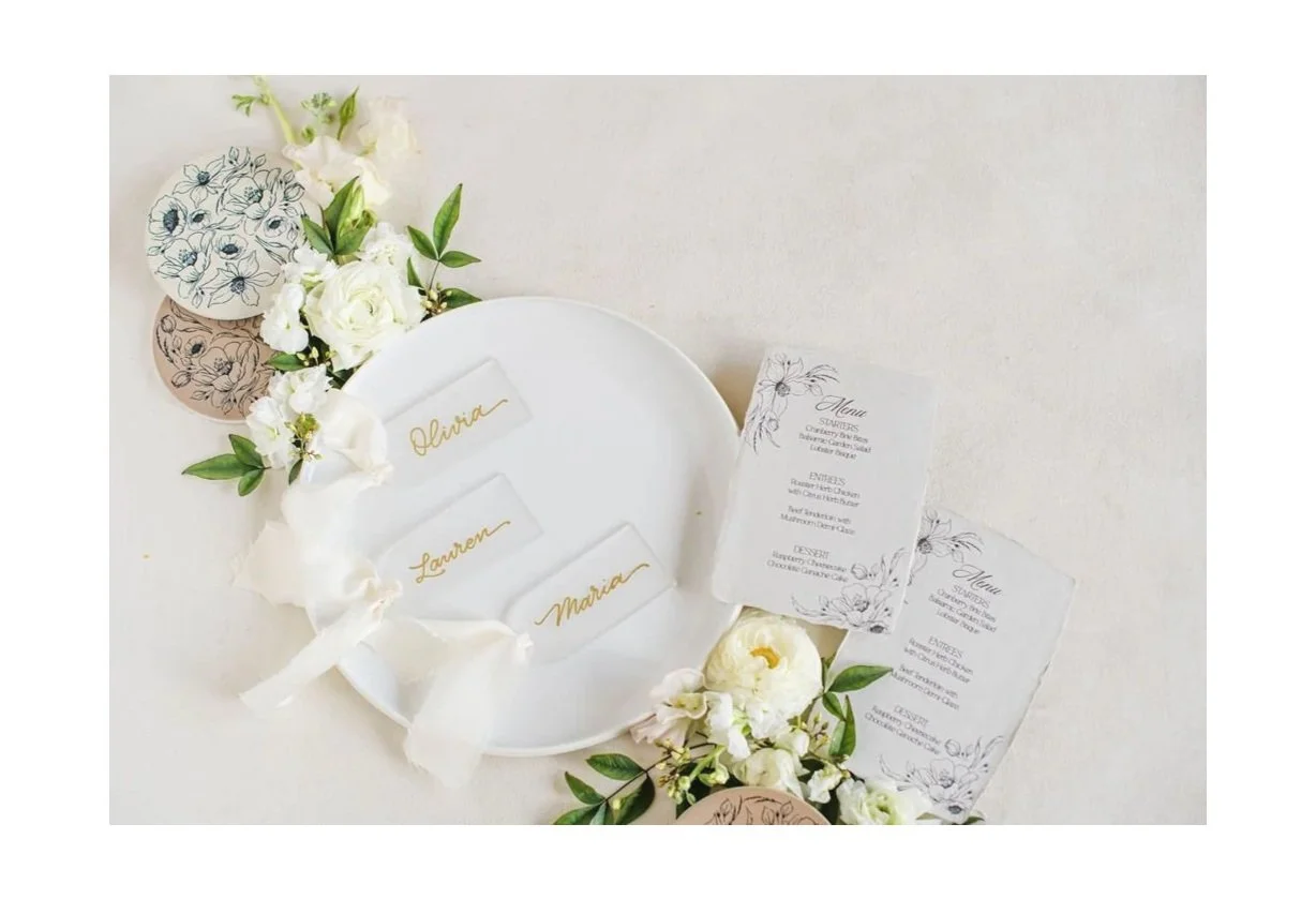 Pricing begins at $10–$20 per guest, depending on the level of detail and pieces selected. Personalization—including color and font adjustments—is thoughtfully included in every package.